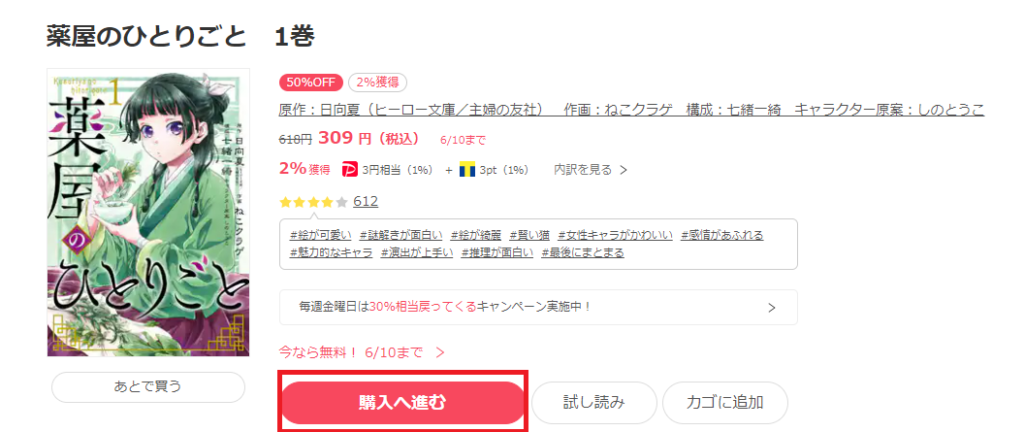 以下のリンクより「水曜は第1巻がお得!200円OFFクーポン」を取得する